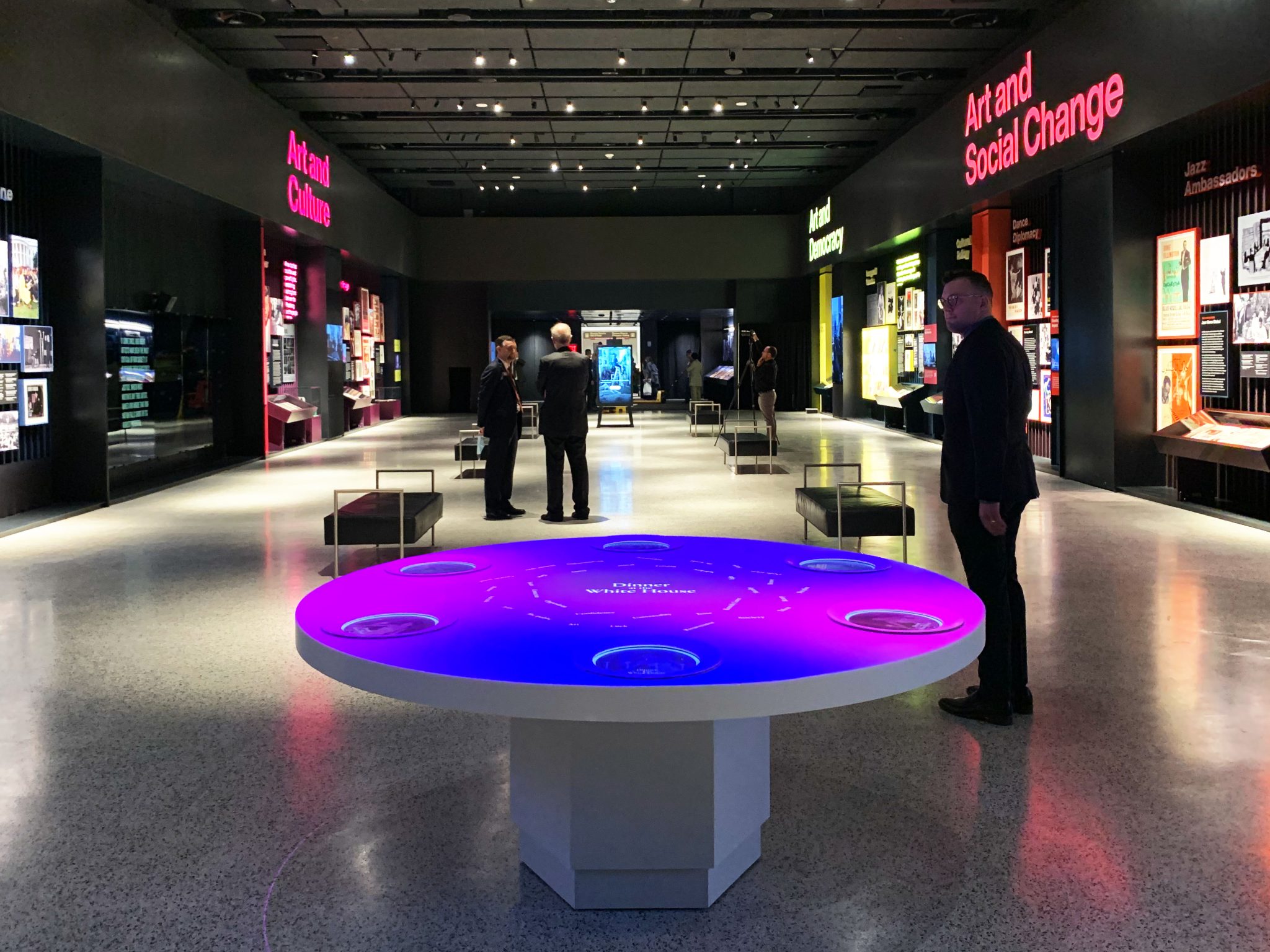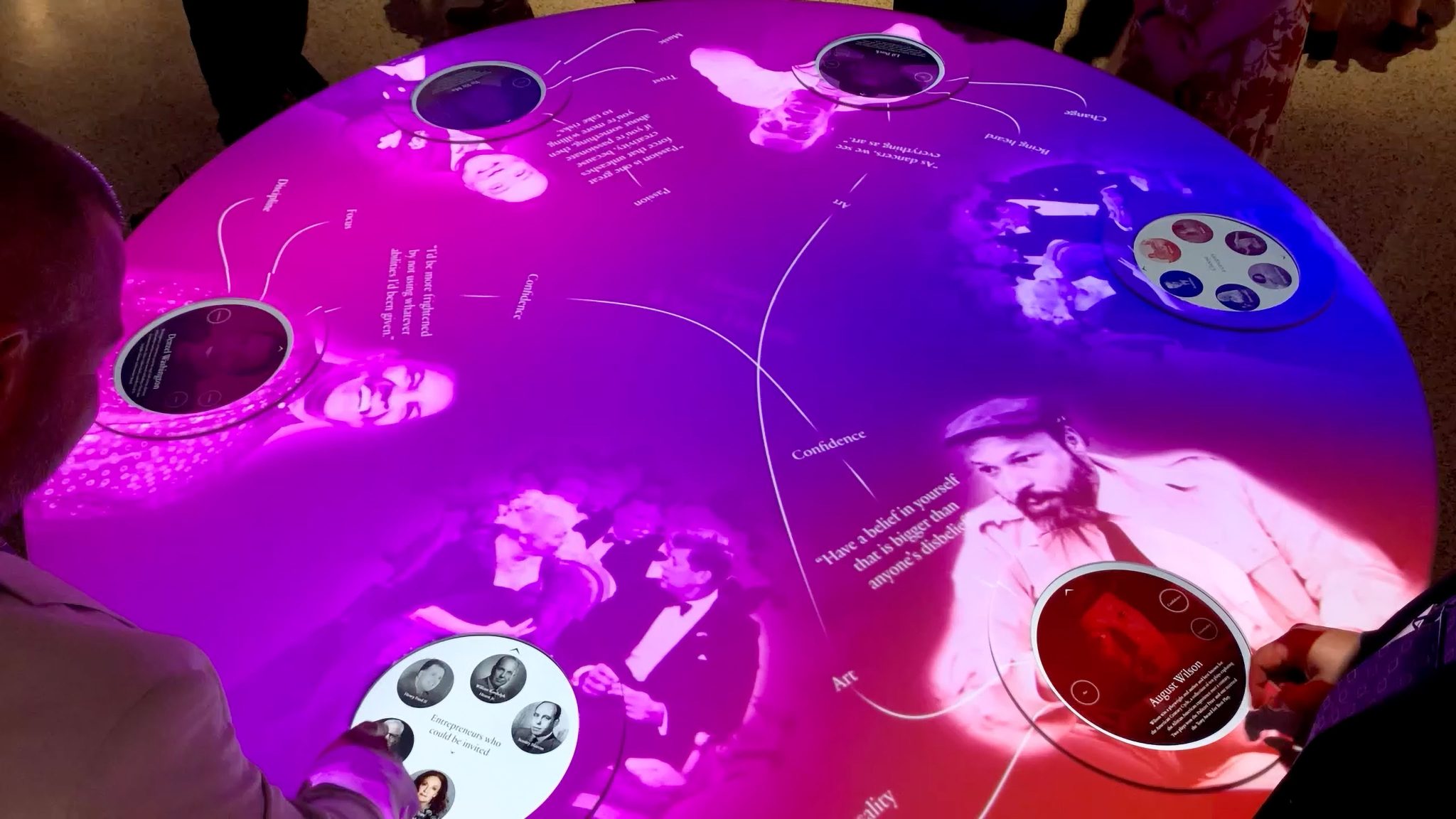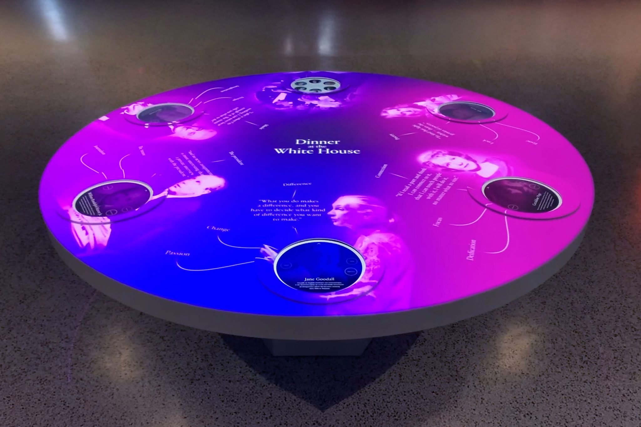 The interactive exhibit ›Dinner at the White House‹ at the Kennedy Center, Washington DC, introduces visitors to dinners hosted by the Kennedy White House, which featured prominent artists, writers, musicians, and cultural figures. A series of touchscreens allows visitors to learn about the historic guests and to propose which contemporary guests they would invite today. Quotes from the invitees appear on the surface of the table suggesting the themes and connections between them.
